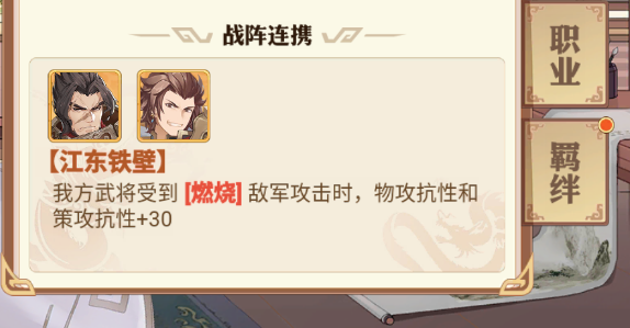周泰的战阵连携需要与孙策同时上阵触发,我方将受到已经有燃烧的敌军攻击时,可以提升物攻抗性和策攻抗性。