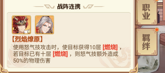 再来看下太史慈的战阵连携,与周瑜同时上阵,使用怒气技攻击时,可以使目标获得10层燃烧,十层燃烧的概念就是行动结束的时候,可以直接让目标损失30%攻击的生命值。如果目标已经有十层燃烧,那么怒气技会额外造成50的物理伤害。这也就可以看出为什么说太史慈是燃烧队的核心,并且为什么燃烧队热度这么高。