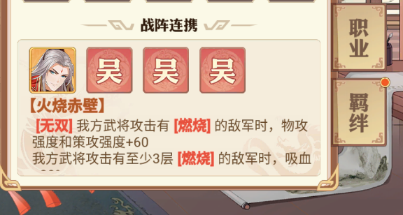 周瑜的战阵连携可以搭配任意吴国将,作为燃烧队唯一有无双技的将,随着燃烧层数的叠加,伤害会越来越高。并且在目标拥有三层燃烧的时候还能吸血。这个将在面对群怪时效果显著,但是遇到单体将还是差了点意思。