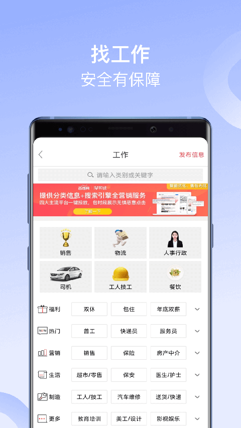 这是一款功能丰富的生活服务平台,你可以在平台上轻松找寻到你钟意的岗位,海量的工作岗位任你选择,各类型的职位都有覆盖到,可以满足你的各种需要,同时各类的场景也都可以适用,无论是全职工作还是兼职都可以选择一番,轻松选中你心仪的职位,生活中的各类问题也可以通过平台解决,无论是家政方面的需要,还是家中的设施需要维修一番,你都可以进行求助,非常方便。