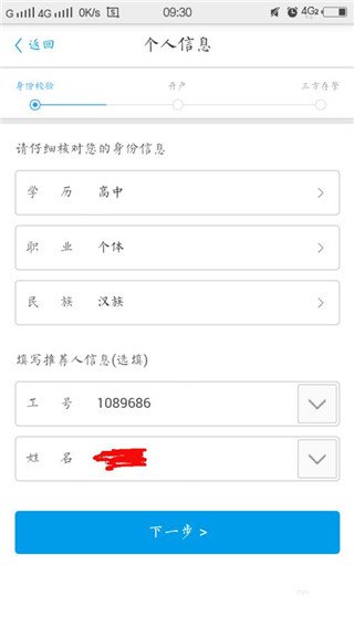 3、再上传自己的二代身份证的正反两面,确保清晰。核对身份证的有效期及其他信息是否与身份证一致,如果都是对的,直接下一步;