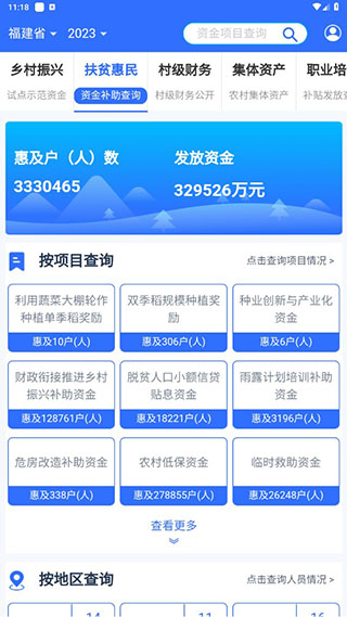 用户点击扶贫惠民就可以查看资金补助的发放情况,并且可以按项目或者地区查询。