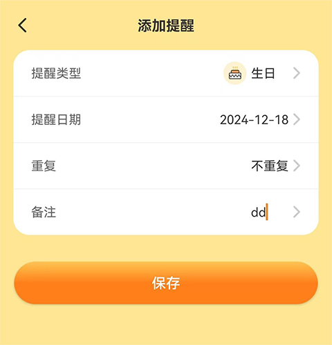3、填写提醒类型、日期、重复类型以及备注,就完成添加了。