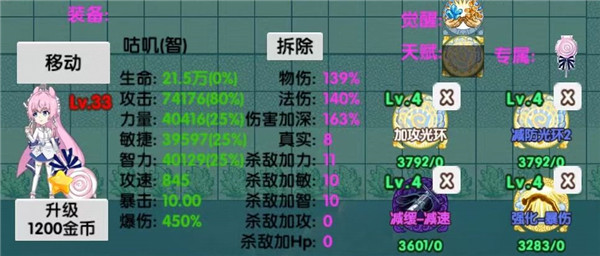潘多拉:目前主C之2,初始天赋是全属性都加攻击。加上本身成长属性还可以,所以我给她带的全是主动爆发技能。同时还给配了一个眩晕-智,眩晕2秒小怪,还是那句话,眩晕分给不同的英雄,心里踏实。。。