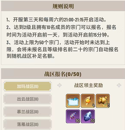 1、在宗门的所有玩法中,宗门争霸玩法可以说是最重要的一个,游戏开服第三天和每周六的21点会开启宗门称霸玩法,符合条件的宗门可以报名并由系统自动分配战区,届时宗门所有成员皆可以出战,并且在活动结束后根据宗门在战区内的排名发放奖励。