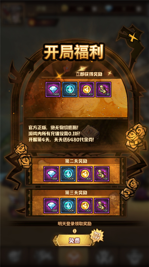 2、首日免费送真充,海量钻石、资源礼包,助力阵容养成
