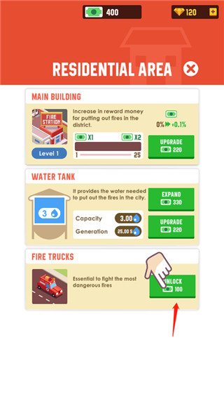 8、当火灾扑灭时,你可以获得大量资源,随后你可以自由的给消防车库进行升级。