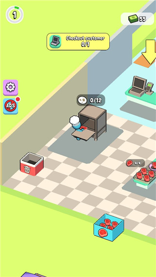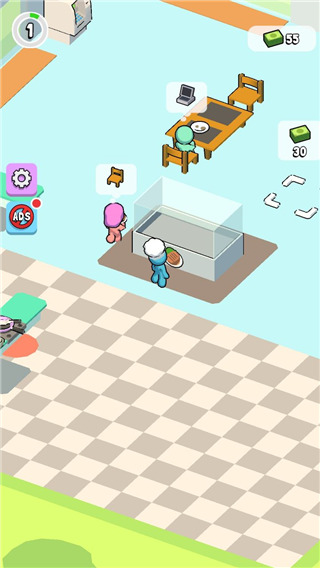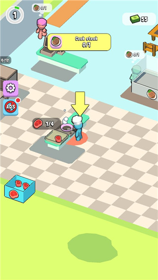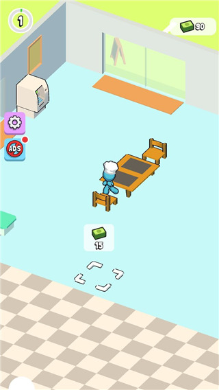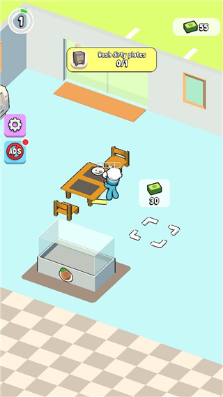 玩法也十分的简单,开局需要购买桌椅,然后还要搞个柜子以及厨房进行烹饪美食,接着有顾客进入用餐,需要快速出餐,同时也要快速收拾餐盘,然后放入洗碗机,等待顾客吃完之后便可进行收银,然后就可以获得钞票,有了钞票之后便可雇佣员工以及升级,还可以购买其他道具。