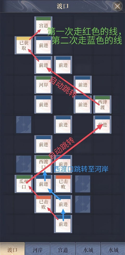 第一次跟着红色的线走,可以获得四个地图碎片再进入一次。