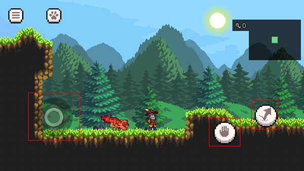 2、玩家可以通过左侧轮盘控制人物移动,右侧按钮跳跃和释放宠物技能。