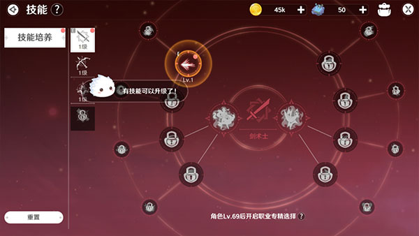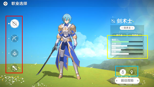 2、红色框代表职业,点击可以切换不同职业,蓝色区域为角色性别,黄色区域为不同职业的技能。