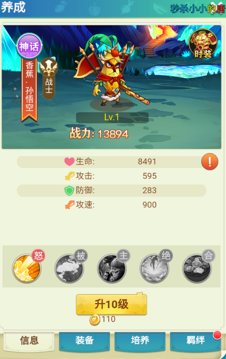 1、孙悟空的大招为水果沙拉,羁绊英雄为猪八戒与唐僧,同时出战可对攻击最高与血量最低的敌人造成高额伤害,并减少敌人闪避与爆抗,并且在技能释放后自身获得霸体与攻击暴击增加的效果;
