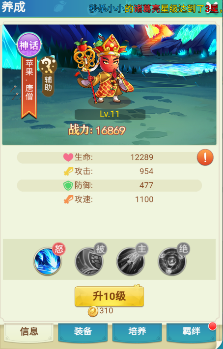 4、唐僧的主要作用为,存活时增加我方全体攻速与降低敌方全体攻速,与孙悟空猪八戒出战,可获得高额防御、暴击与增伤效果。