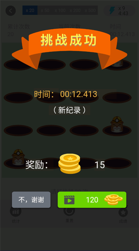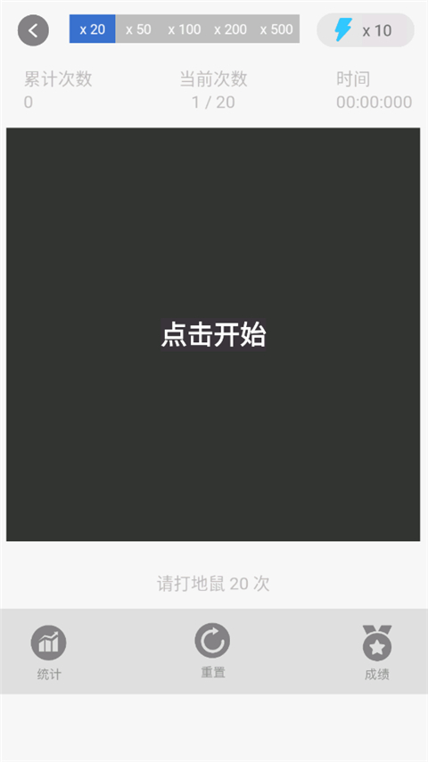 3、我们任意选择一个点击模式进入,在游戏界面下方统计了你的游戏次数和游戏成绩,顶端则可以看到当前的点击次数和游戏时间;