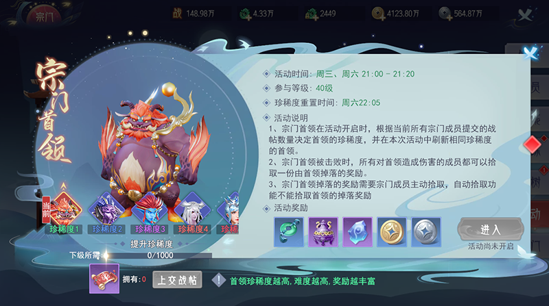 宗门内的玩家获得宗门战帖后可以提交至宗门首领处,提升宗门首领的珍稀度。宗门首领被击败时,所有对宗门首领造成伤害的成员都可以拾取一份由首领掉落的奖励。