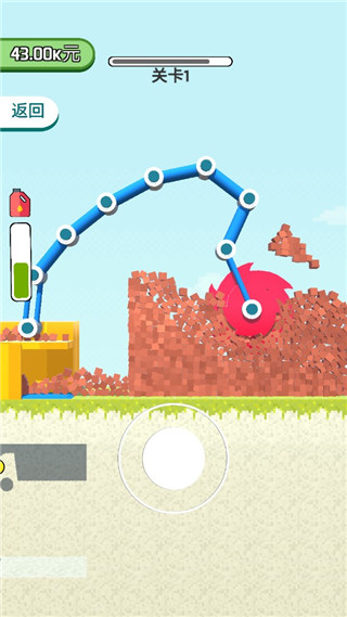 铲斗破碎机是一款非常解压的休闲游戏,游戏在画面上采用了卡通画风,画面十分清新精致,游戏玩法丰富,在这里玩家将会控制一台机器进行拆墙操作,来破坏墙面等建筑物,每个关卡都有不同的任务要完成,通过完成任务来获得奖励升级铲斗机,这样就能释放更大的威力。同时玩家也可以利用铲斗的铲子去破除墙壁,将墙壁上的砖头挖下来,挖下来的砖头将变成玩家的金币物资,挖的越多,金币就越多,而金币可以升级铲斗的长度、力度、还有增加挖机的油量,这些可以帮助挖机更好的破拆墙壁,当玩家将挖机升级到一定的强度之后,将整面墙壁都破拆完成了会进入下一关卡。除此之外,铲斗破碎机游戏玩法十分丰富,并且每一关的关卡玩法都不一样,会有不同的图案组成,十分有趣与新颖。