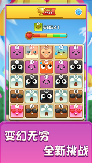 表情大作战游戏内每一个表情包头上都会有一个数字,将相同的数字点击就可以进行合并,操作玩法和经典的三消玩法是一样的,通过表情包合并能够组合成全新的图案,全新的图案会让玩家有一种期待感。