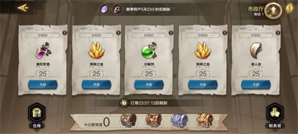 市政厅每天会随机刷新5个特产订单任务,需要通过自己或他人的帮助提交所需资源,完成任务后获得繁荣度,可获得宝箱奖励!