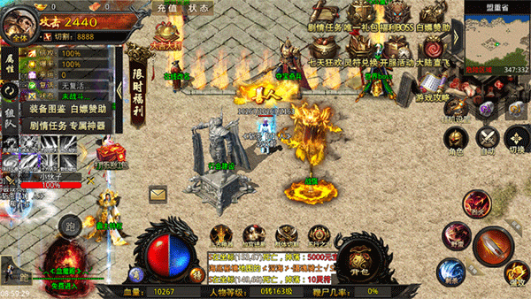 3、在玩法方面,以打金、升级、爆装、抢沙等传奇核心玩法为主。