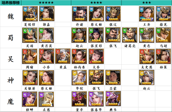 推荐榜主要针对普通玩家前期会使用到的英雄进行推荐,主公以及较难获取的稀有武将不在里面,5星推荐是前期使用体验较好的武将,最好根据实际抽到的武将进行搭配。