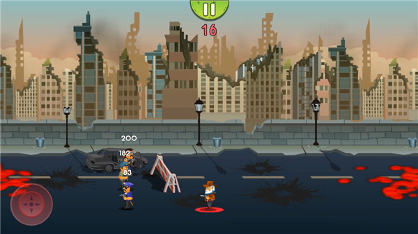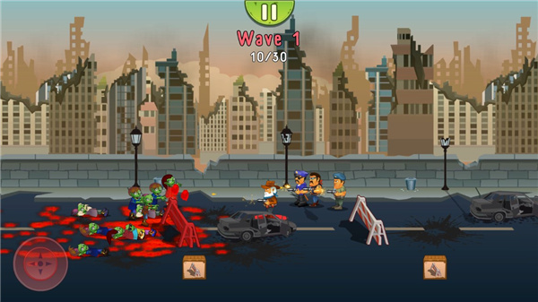 玩法非常简单好上手,不需要玩家自己手动开枪射击或者搏击,只需要操控游戏界面左侧的摇杆控制角色的前后左右移动即可,在僵尸出现的时候英雄会自动射击,在战斗过程中天空会时不时的掉落装备,有路障、围栏、机关枪、子弹、医药包等各种帮助通关的东西,这些东西你和你的队友都可以领取,但是建议互相多多协商,将有限的物资发挥出无限的作用,尤其是路障,路障摆放的位置是很关键的,如果摆放的好的话僵尸是完全近不了身的。