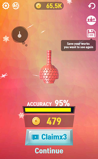 玩法上十分简单只需要玩家们控制雕刻工具即可,圆柱形的冰面会自动旋转,而你需要做的便是将工具好好利用即可,对了每个关卡当中都有雕刻的要求哦,形状都在冰面当中有限制,当玩家们雕刻玩之后,系统会进行打分操作,雕刻的越好获得奖励将会越多呢。玩家还可以在冰雕游戏中跟随游戏中的对应任务来制作出相应的艺术品,或者通过闯关解锁更多好用的工具,再根据你的想象力来创作!
