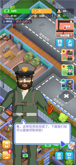 游戏的画面用了卡通风格,看起来既可爱又不失专业感。里面的建筑种类特别多,比如教学楼、飞行训练场、坦克射击场等等,每个地方都有不同的功能,需要合理安排才能让学校发展壮大。玩的时候感觉就像在管理一个军事社区,得不断升级设施、完成任务才能赚到更多钱。