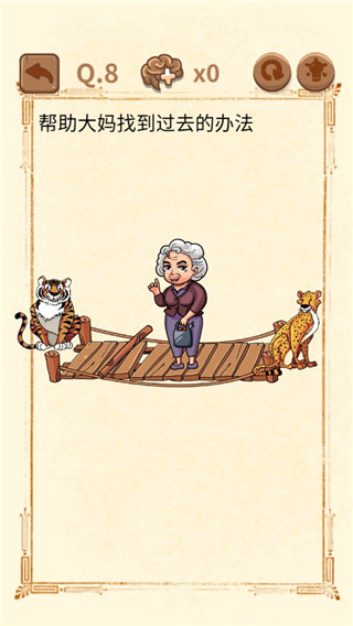 《大妈的灵魂拷问4》是一款充满创意的解谜游戏,玩法新奇有趣,每一关都让人脑洞大开。游戏里有各种天马行空的谜题,比如“用手指盖住左眼”、“找出黑板”甚至“计算10分钟放多少炮”,这些题目不仅考验逻辑思维,还充满幽默感。我玩的时候觉得有些关卡确实挺难,但解开后的成就感特别强。游戏设计得很巧妙,谜题的答案往往出人意料,让人忍不住想一直挑战下去。对于喜欢解谜的人来说,这款绝对是个好选择!不过有时候真的会被难住,可能需要一点提示辅助才行。