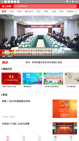 1、打开掌上邯郸app,【首页】会显示当下的时事快讯,最上方可以按列别查看,下方则是软件的精品栏目和新闻要点。