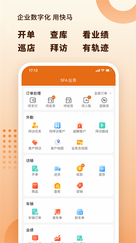 快马数字手机App是一款无缝整合线上分销和线下批发的新型数字化营销管理软件。它帮助企业搭建线上线下一体化的运营管理平台,对内连接员工、对外连接客户,通过数据反馈问题并驱动经营决策。
