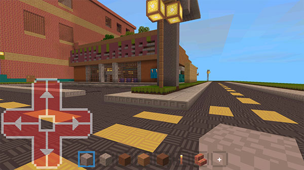 3、以辛普森小镇地图为例,点击进入,可以看到小镇建筑,左下角按钮控制自由移动,右侧区域点击即可使用装备。