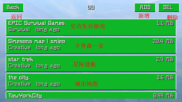 2、选择地图页面,包含有史诗生存地图、辛普森小镇、星际迷航以及城市等地图,右上角【ADD】表示新增地图,可以自主创建,而【DEL】可以删除不想玩的地图,减少空间内存占用。