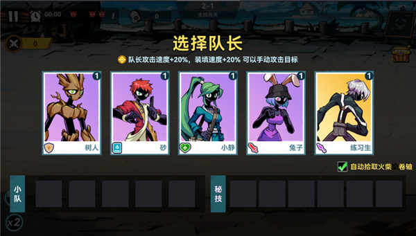2、选择一个队长,队长可以获得相应的属性提升,建议使用强度高的,(这里我们选择的是练习生)