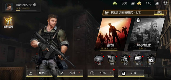 1、首先我们进入僵尸危机游戏中,游戏有两个模式一个是剧情模式一个是PVP模式,剧情就是闯关,而PVP则是要通过第十个关卡才会开启;