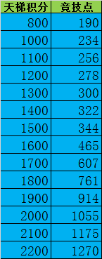如图所示,为天梯积分对应获得的竞技点数,获得的竞技点数不是为固定值,例如天梯积分为900分,所获得的竞技点为190合234的中间值。