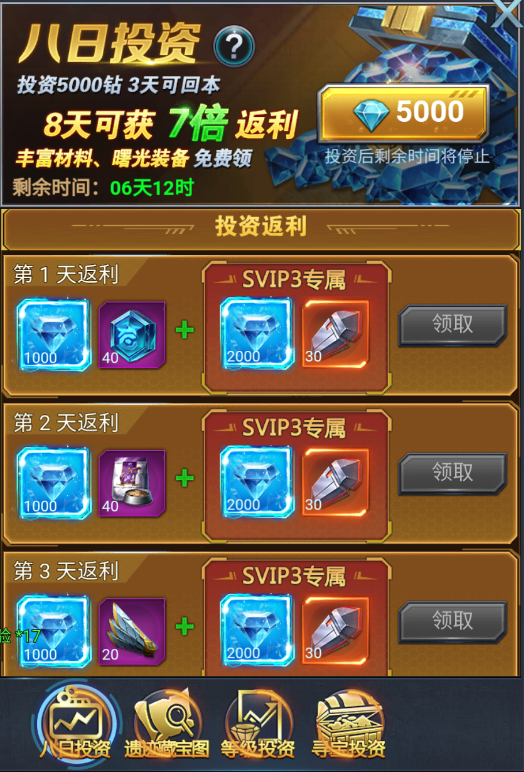 这些都是买了绝对不会亏的奖励,而且前两个只需要钻石即可激活,如果你前几天犹豫,觉得不值,也没关系,你可以多玩玩再决定,因为投资在有效期内激活,都会锁定时间,你不用担心因为晚激活几天就拿不到全部奖励,在有效期内,等你觉得可以投资时,随时都行!