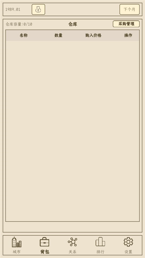 4、接下来进入背包,玩家可以进行采购管理,前提是玩家需要建立自己的对应的店铺。