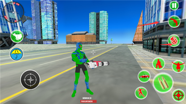 7、神奇蜘蛛绳索英雄手机版下方则是奔跑、吸汽车、下蹲、跳跃、瞄准镜、开火键位;