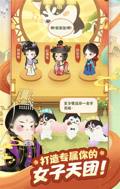 收集你最爱的美人,练习成团,文、武、乐、舞、画、颜、戏,全方面提升业务水平,作为某某朝第一女子天团,我们要有颜、有艺、还有才,然后惊艳所有人!!