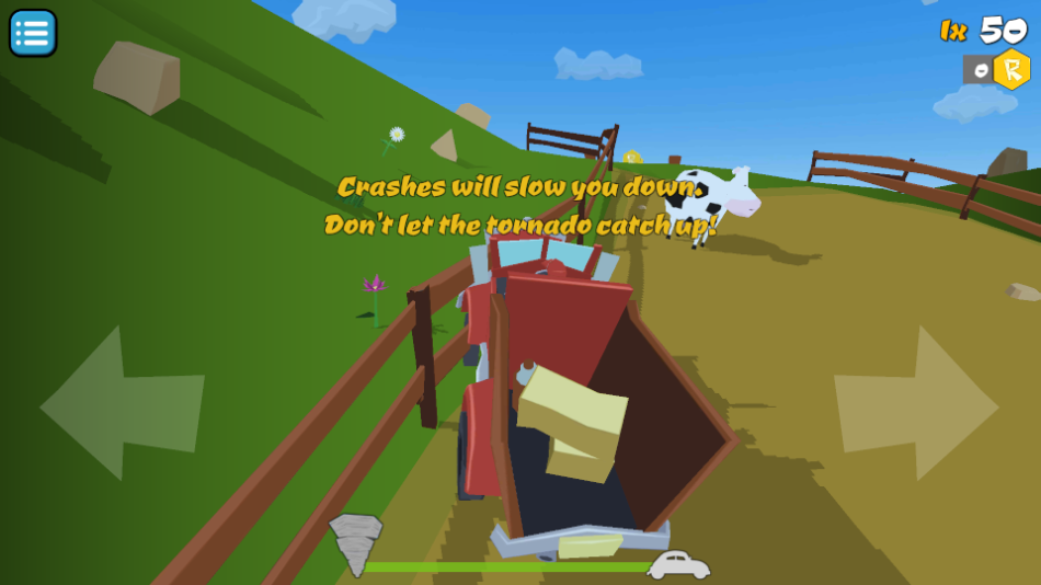 2、驾驶不同的载具在道路上狂奔,逃离身后的龙卷风。玩家在游戏中要一边狂奔