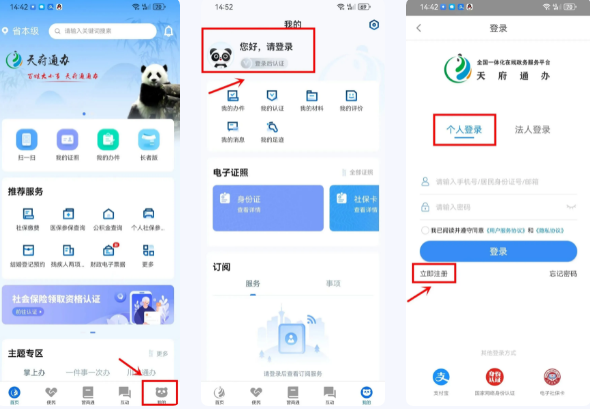 第一步:打开“天府通办”APP,依次点击首页下方菜单栏【我的】——【您好,请登录】——【立即注册】按钮。