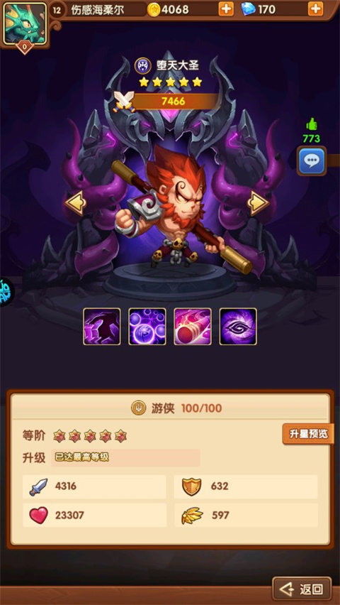 主动技能能在击中敌方前排是降低护甲并且石化,后排时降低攻击并且减缓敌方英雄速度。