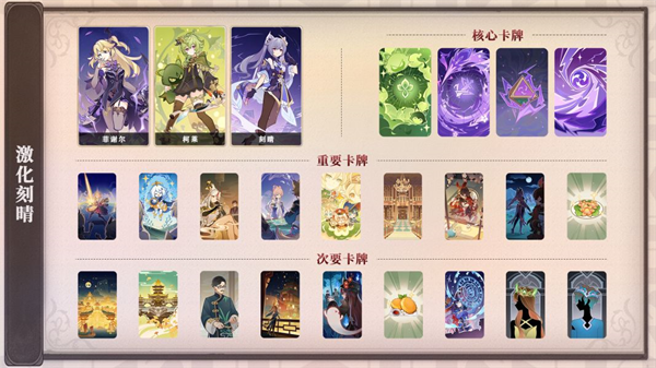 (2)队伍中一般放两个核心,注意不是输出,而是核心(也就是队内地位),以两个角色为核心构筑卡组目的就是防止卡牌太过杂乱,难以抽到核心角色所需的卡牌