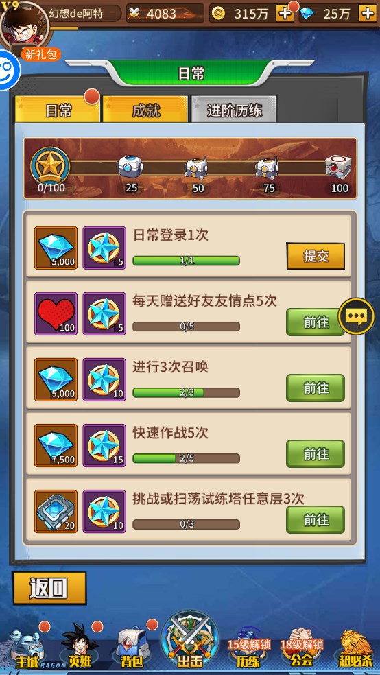 完成新手指引后,会开启每日任务,根据任务提示去完成,可以获得大量的经验。