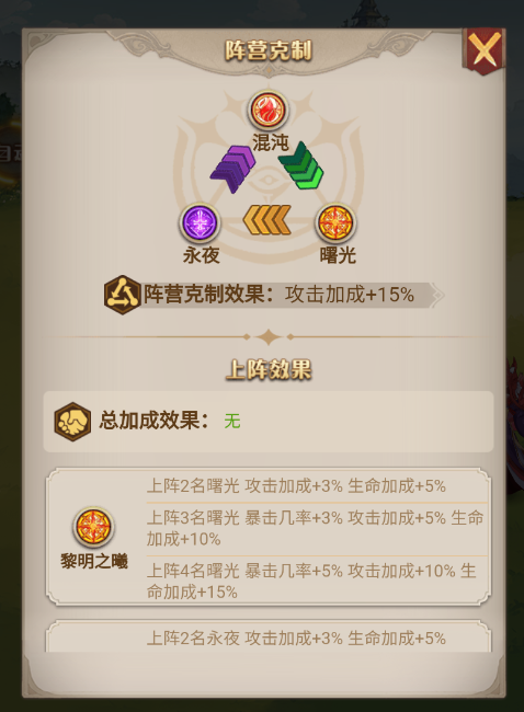 3、阵营之间会有相互克制的效果,上阵相同阵营的英雄会有羁绊加成。