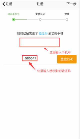2、收到验证码后录入,点击“下一步”;