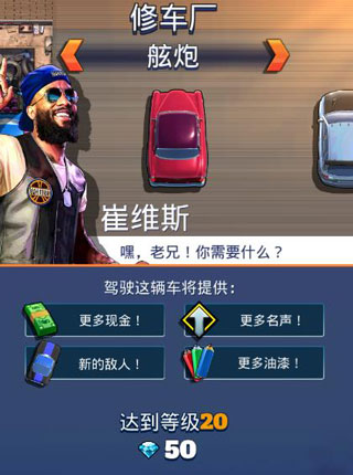 1、车辆解锁:每升10级都可以用钻石解锁更强的车辆,且解锁的车辆会为你提供更多的现金、名声、敌人和油漆。