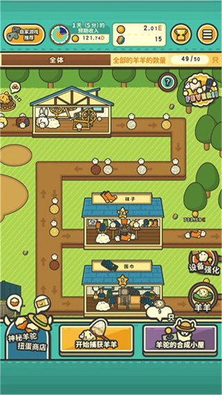 游戏中玩家拥有一个非常大的羊场,玩家需要不断的去捕捉各种不同的羊羊,然后通过羊羊来把你的农场扩大,不断的去制作各种不同的羊毛袜子、帽子等等,制作这些可以给带来很多的金币,玩家又可以利用金币来升级自己的羊场和袜子工厂等等,等级越高我们获得的金币也就越高。并且游戏中有各种不一样的羊,而这些羊带给我们的收入也就不一样,而且每一个都非常的可爱啊!