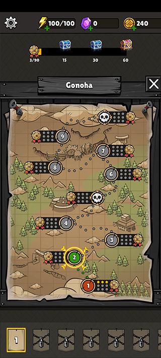 6、利用火柴人忍者的敏捷动作开始战斗吧,获得胜利会有相应的关卡奖励,房子按钮回到首页,地图按钮选择关卡,最右侧的按钮点击可以直接进入下一关。