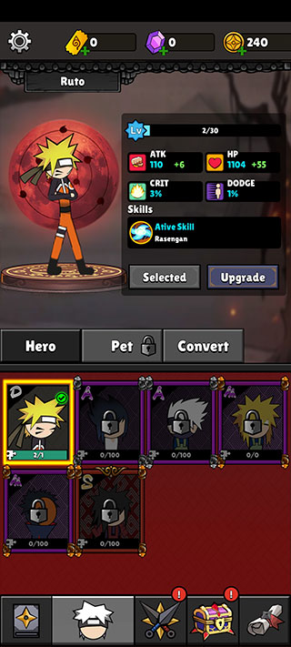 - 在角色页面,可通过【Upgrade】升级角色,并选择心仪的忍者和宠物技能。